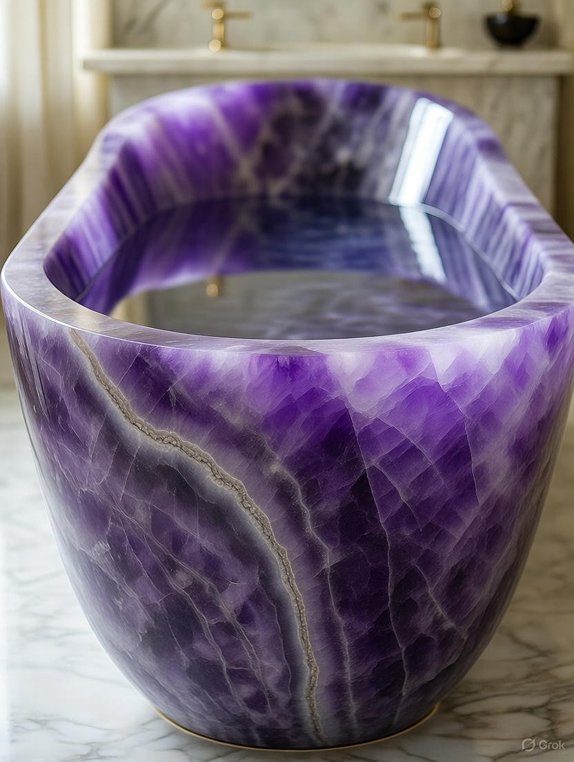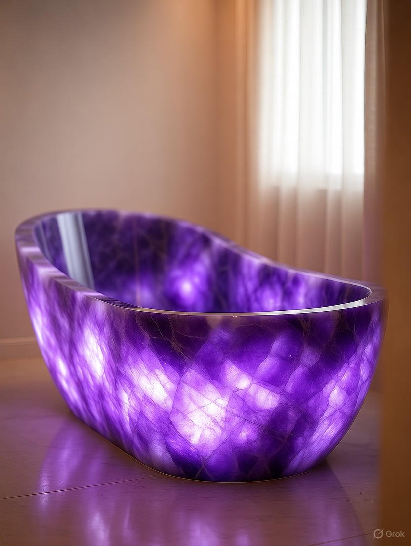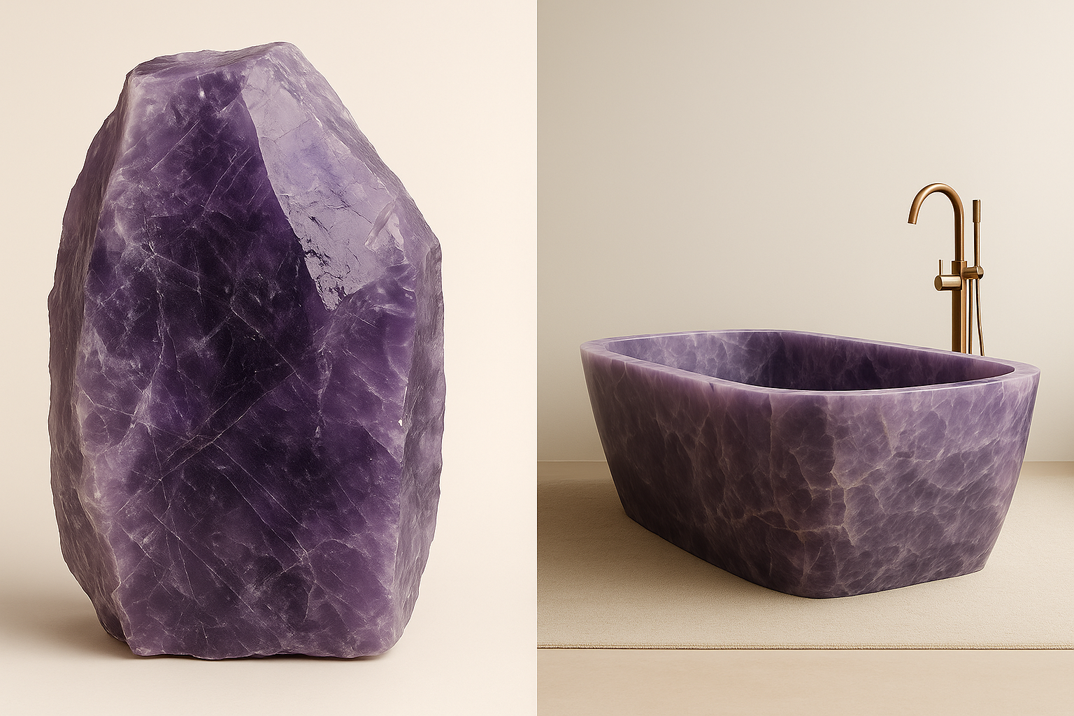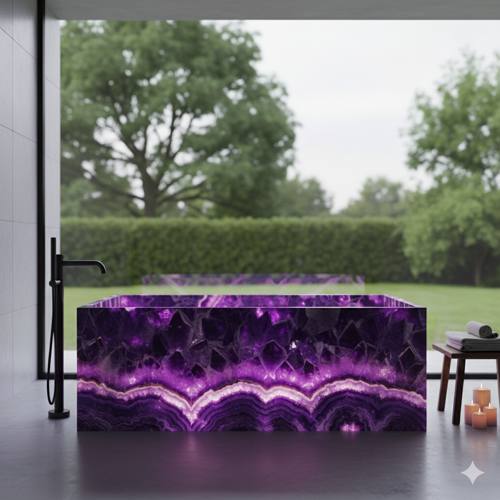Amethyst Quartz is a semi-precious crystal celebrated for its rich purple hue and translucent depth. Known as the “stone of calm and creativity,” it brings a regal yet soothing aura to interiors. Its unique crystalline structure makes every bathtub a one-of-a-kind masterpiece that retains warmth and adds timeless sophistication.