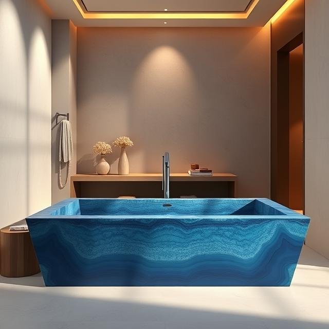 Our Blue Agate Bathtubs are showpieces of craftsmanship and natural beauty. Hand-carved from premium semi-precious Blue Agate stone, these bespoke tubs showcase vivid blue hues, intricate banding, and subtle translucency. They transform ordinary bathrooms into serene spa-like retreats while offering lasting durability and unmatched elegance.