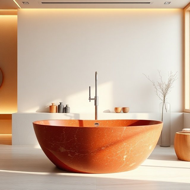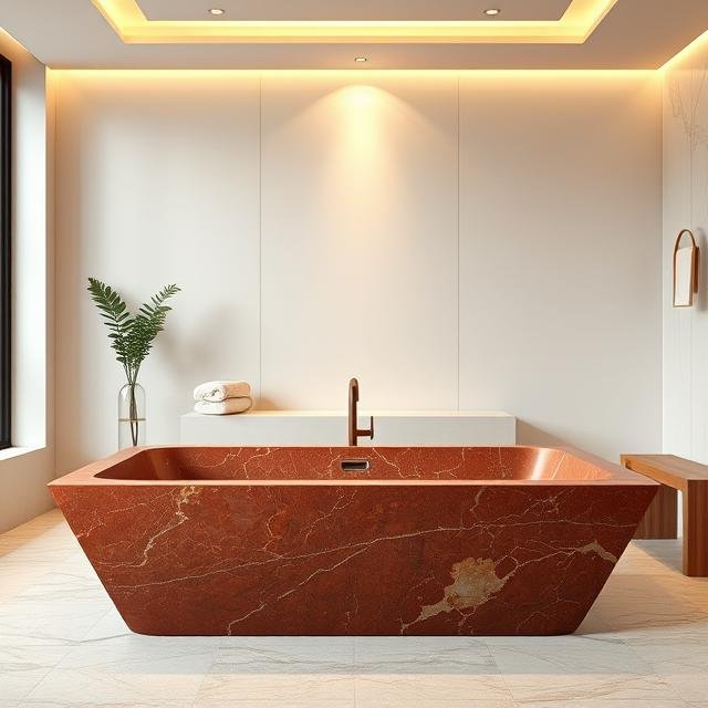 Our Red Jasper Bathtubs combine bold colour with timeless craftsmanship. Each bathtub is carved from premium semi-precious Red Jasper stone, showcasing deep red hues with subtle brown and golden veining. These bespoke tubs transform ordinary bathrooms into serene spa-like retreats while offering durability, comfort and striking visual appeal.