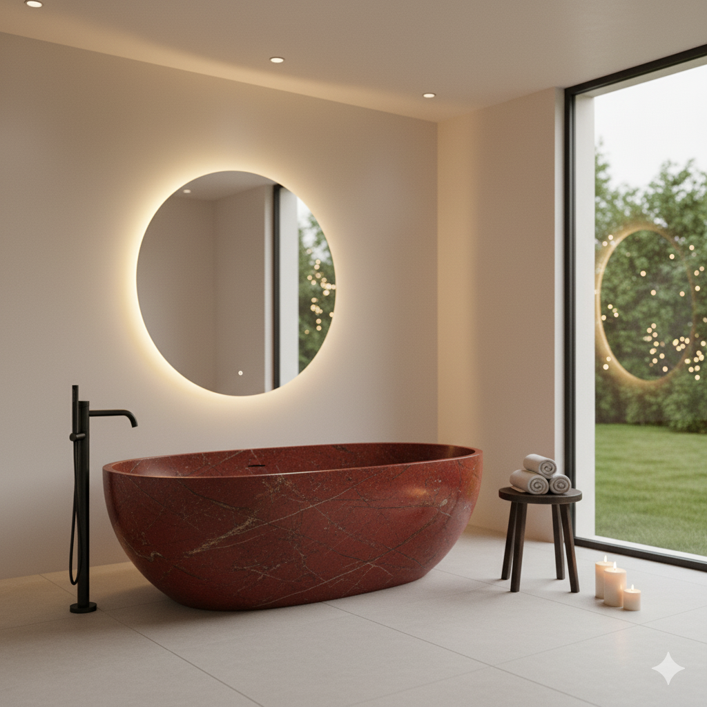 Red Jasper is a semi-precious stone admired for its rich brick-red colour and grounding energy. Known as the “stone of endurance and stability,” it adds warmth and vitality to interiors. Its unique veining and inclusions make every bathtub a one-of-a-kind masterpiece that retains both beauty and strength over time.