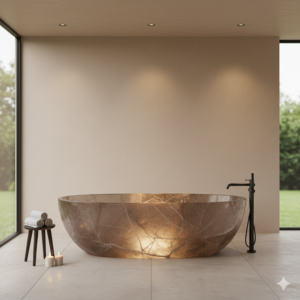 Smoky Quartz is a semi-precious crystal admired for its rich, smoky brown-grey colour and natural clarity. Formed over millions of years, it adds depth and understated luxury to interiors. Its smooth, durable surface and unique crystalline patterns make every bathtub a functional work of art that stands out in upscale residential and hospitality spaces.