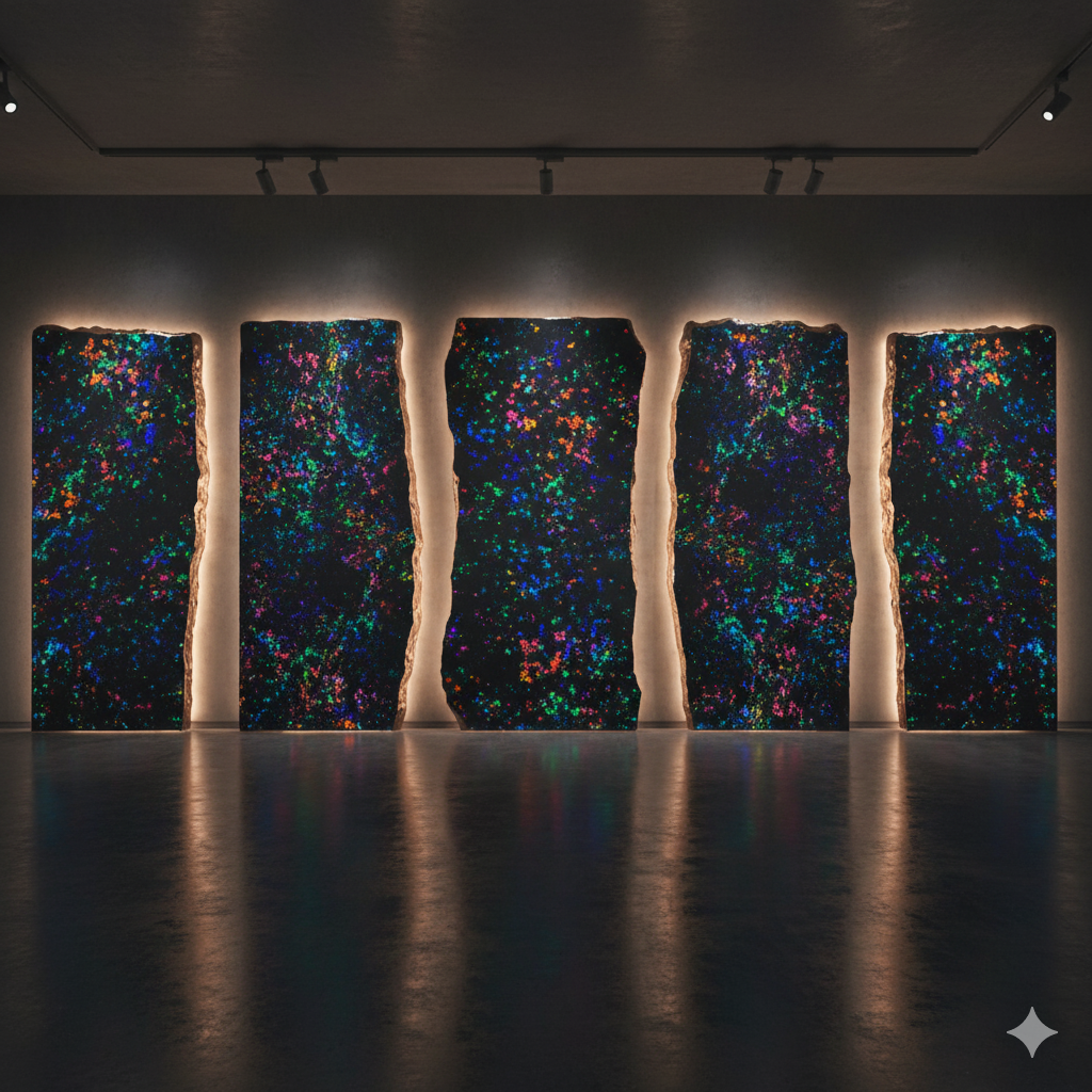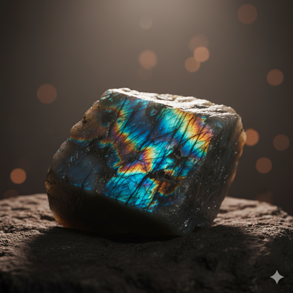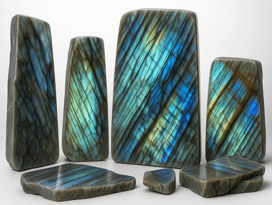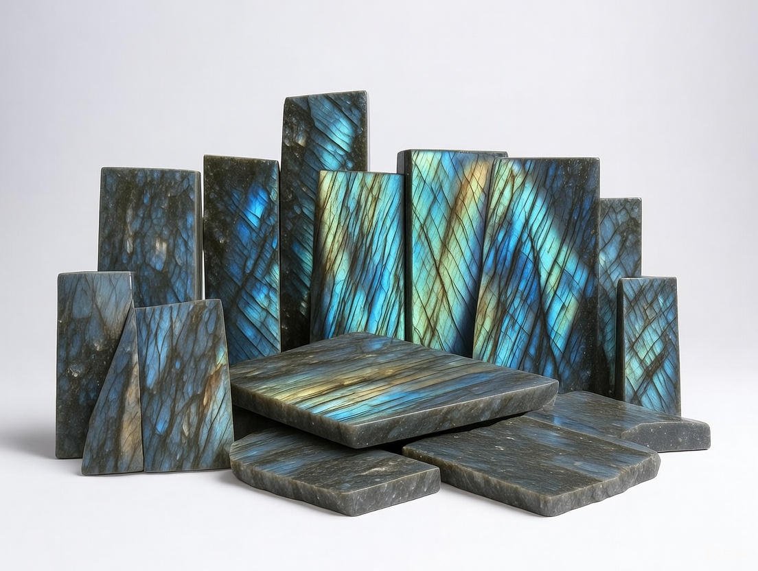 Labradorite is a semi-precious gemstone admired for its distinctive optical phenomenon known as labradorescence — a shifting play of colours that appears as light moves. Formed over millions of years, it combines a rich dark base with iridescent flashes, making every slab a natural masterpiece. Durable and versatile, it is perfect for high-end interiors seeking a bold yet refined statement.