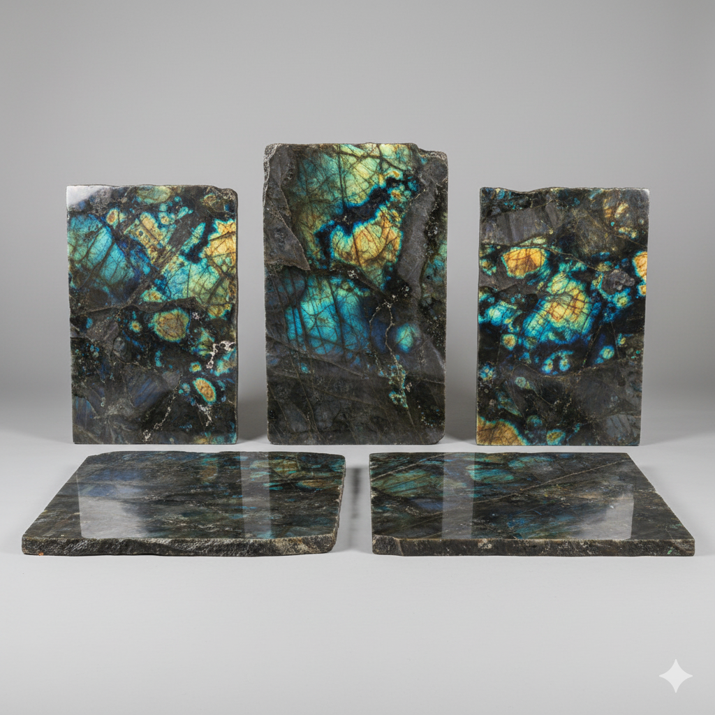 Our Labradorite Slabs offer a stunning combination of deep grey tones and shimmering flashes of blue, green and gold. Ideal for luxury flooring, countertops, feature walls, and reception desks, these slabs are hand-selected and precision-finished to showcase the natural brilliance of this semi-precious stone. Each slab is unique, adding drama and sophistication to any residential or commercial space.