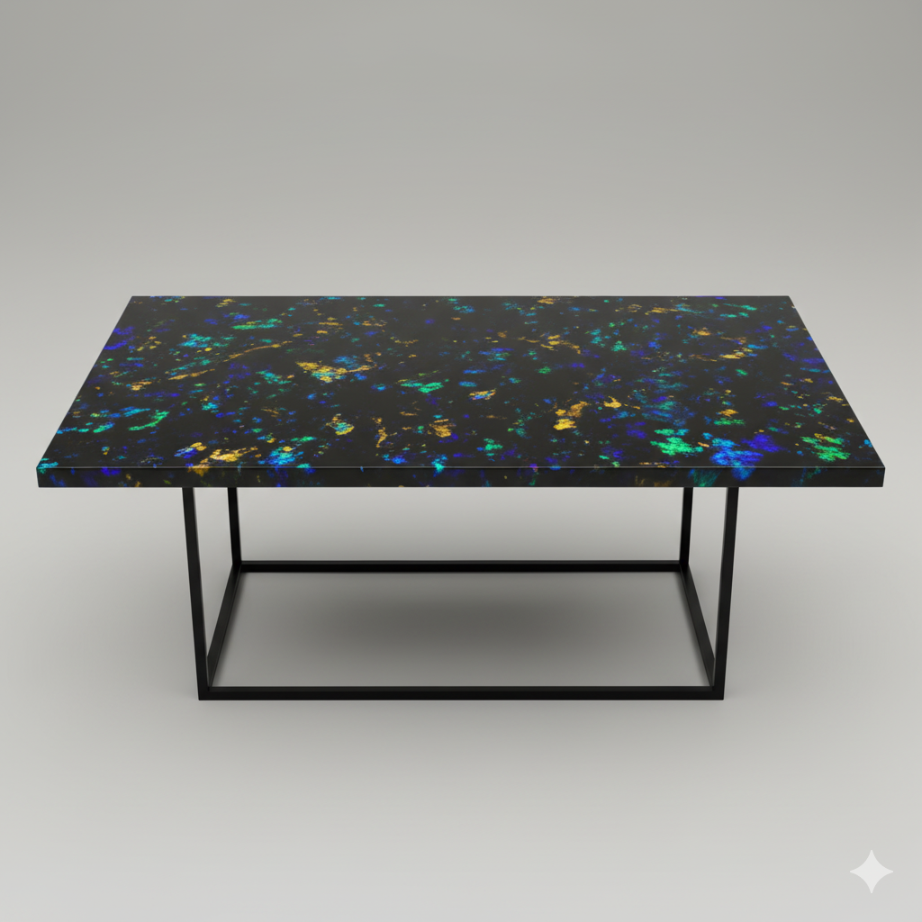 Our Black Opal Table Tops combine dramatic natural beauty with outstanding functionality. Handcrafted from premium semi-precious Black Opal stone, these tops feature a deep dark base illuminated by iridescent flashes of blue, green and gold. Perfect for dining rooms, lobbies, boardrooms and luxury hospitality settings, they transform everyday furniture into show-stopping centrepieces.