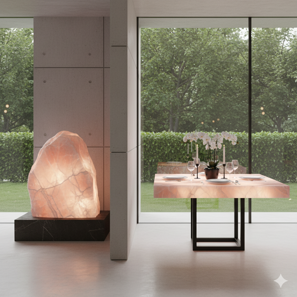 Our Rose Quartz Table Tops bring soft elegance and natural luxury to dining rooms, living areas, lobbies, and boardrooms. Handcrafted from premium semi-precious stone, each piece showcases a translucent blush-pink hue and sparkling crystalline patterns. These table tops are not only stunning centrepieces but also durable enough for everyday use in upscale environments.